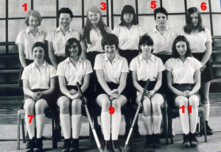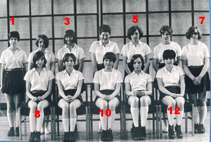 1964-65 Aspiring Girls Hockey Players. Not a stick in sight ! 1. Aileen Norton, 2. Jean Derbyshire, 5. Carol Etheridge, 10. Delia Whitehead, 12. Valerie Parker. Photo thanks to Jean (Derbyshire) Thompson.