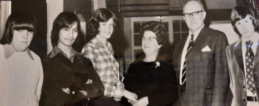 1975, March. Prizewinners at the 1975 Speech Day (which was held in the School Hall). L to R are: Steve Bevan, John Behardien, Patsy Kane, Mrs. Connie Rhodes, Mr. Boothman (Head of Ellesmere Park School) and Paul Kane. Thanks to John Behardien who gave us the photo,